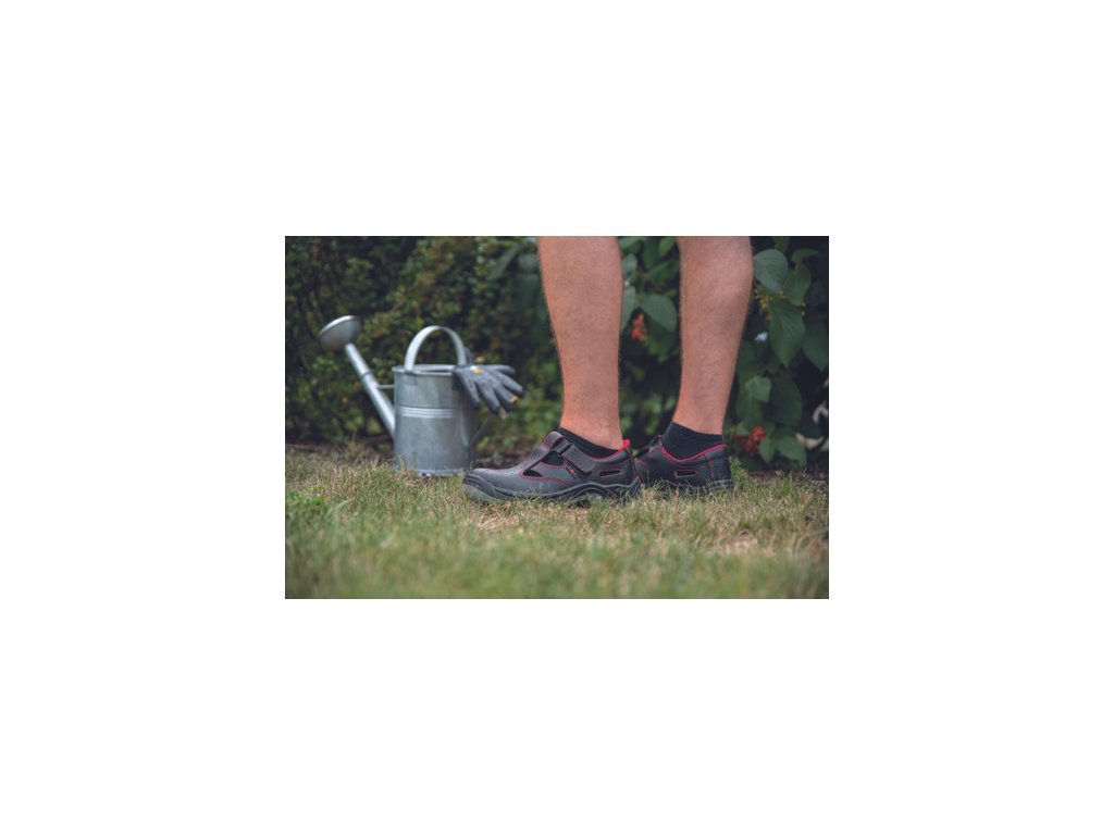 Klasické bezpečnostní sandály s ocelovou stélkou proti propichu a ocelovou tužinkou ve špici, která chrání před stlačením silou do 15 kN nebo pádem břemena o váze do 20 kg z výšky 1m. Antistatická podešev vyrobená z dvouhustotního polyuretanu garantuje nejenom komfort, ale i bezpečí díky protiskluzným vlastnostem podrážky, která je navíc rezistentní olejům a oděru. Svršek obuvi je vyrobený z přírodní štípenkové kůže a vnitřní podšívka z prodyšného polyesteru. Uzavíraní pomoci suchého zipu zaručuje rychlé a pohodlné nazouvaní. Díky skvělému poměru cena/kvalita zpracování je tento model velice oblíbený mezi zákazníky, pro které cena je jedním z hlavních kritérii při pořízení bezpečnostní obuvi. Klasický, nerušivý design se bude perfektně hodit k většině kolekcí pracovních oděvů značky Fridrich&Fridrich.