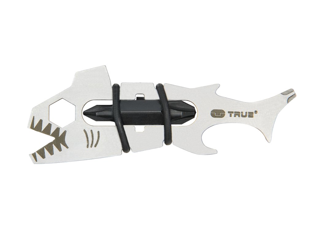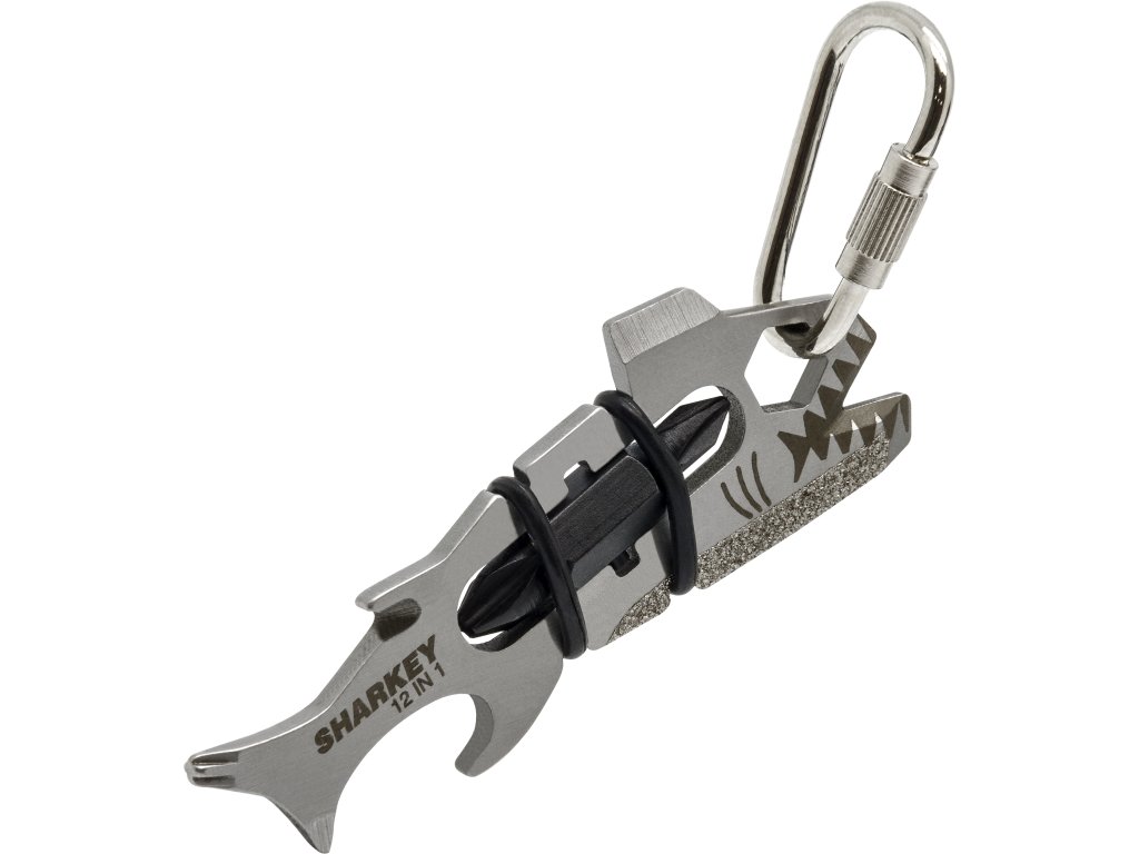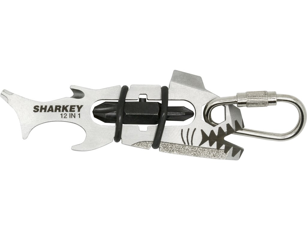 Sharkey je kompaktní multitool od značky True Utility ve tvaru žraloka, který i přes své malé rozměry skrývá několik šikovných nástrojů, které využijete v každé situaci. Se svou vahou, která činí pouhých 18g si ani nevšimnete, že u sebe nosíte 12 nástrojů. Kromě tradičního otvíráku na lahve najdeme na multitoolu také 6 druhů šroubováků, nůž na otvírání kartonových krabic nebo pilník na nehty. Hlavní přednosti: · kvalitní nerezová ocel · mimořádně lehký a skladný · široká paleta nástrojů · elegantní provedení · karabinka pro zavěšení na klíče či batoh Multitool obsahuje: · 3 křížové šroubováky · 3 ploché šroubováky · šestihranný imbusový klíč 1/4 palce · otvírák na lahve · 2x elastická gumička · řezák · pilník · čistič nehtů/ otvírák kartonových krabic ROZMĚRY: ·Délka: 68 mm ·Šířka: 25 mm ·Hloubka: 8 mmDoplňkové parametry